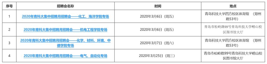 将于2020年3月-4月举行“2020年青科大集中招聘月”活动,诚挚邀请各用人单位到校招聘,企业报名方式详见招聘会链接;欢迎广大毕业生积极参加。