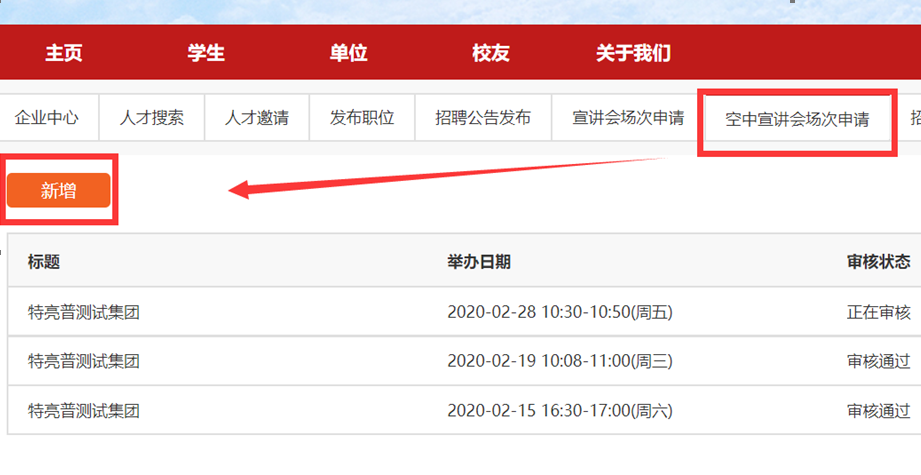 单位登录后,进入单位中心,点击顶端菜单:空中宣讲会场次申请,点击新增。