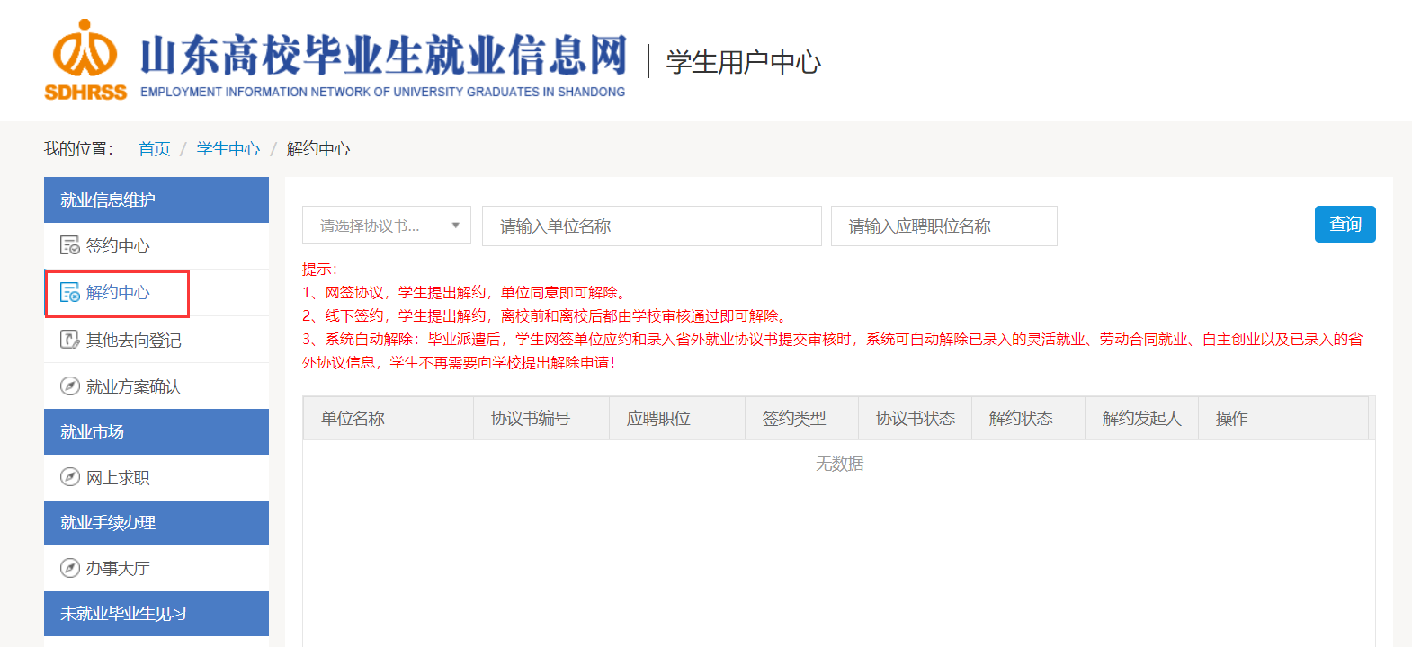 毕业生录入省外协议保存并生成协议书后,如解除双方协议。可通过省信息网“解约中心”栏目中找到解约单位记录完成解约。