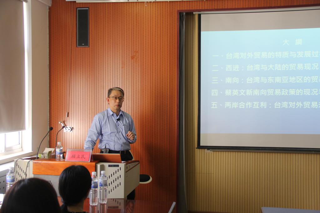 对顾教授到来表示热烈的欢迎!顾教授为大家做了题为《西进与南向—台湾对外贸易政策的走向与未来》的精彩报告。其主要内容包括五部分:台湾对外贸易的特质与发展过程;台湾与大陆的贸易现状;台湾与东南亚地区的贸易现状;蔡英文新南向贸易政策现状与困境;两岸的合作互利。顾教授认为,台湾新南向政策的实施将面临很大的困境,台湾未来的出路是:加强和大陆合作,实现合作共赢。