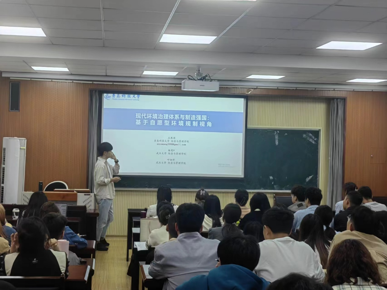本次沙龙以成果分享为主,结合现代化环境治理体系日益完善、制造业竞争力亟待进一步提升的双重背景,王恩泽老师以自己的论文为基础向大家介绍了自愿型环境规制的相关理论。在分享过程中,王老师的语言通俗易懂,同时结合自身投稿经历,为同学们提供了宝贵的经验,赢得了现场同学的热烈反响。