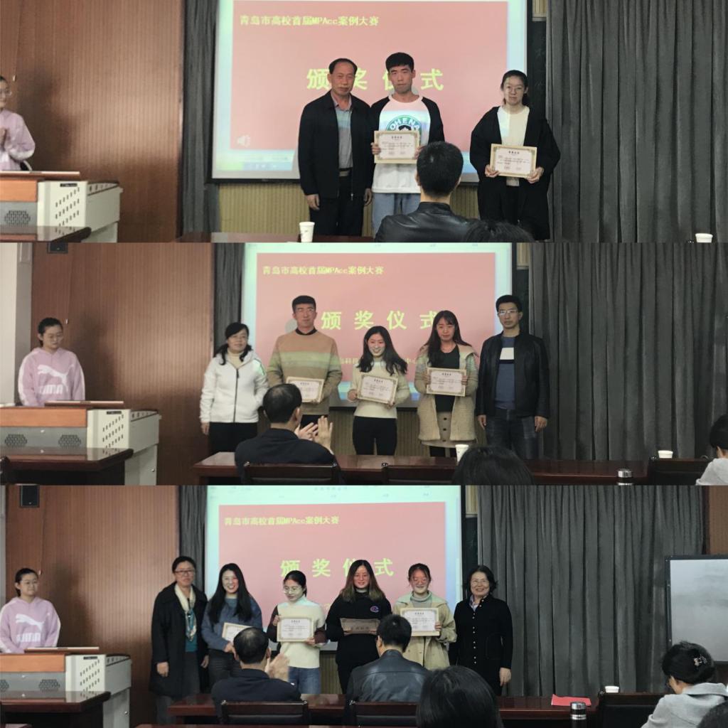 院长王志宪教授、副院长杨友才教授和董华教授、MPAcc教育中心主任刘树艳教授以及财务与会计系主任张占贞教授为在青岛市高校首届MPAcc案例大赛初赛中获奖的队伍颁奖,其中,获得一等奖的是:skrplus队、超越队;获得二等奖的有:七喜队、星辰队、WIN了队;获得三等奖的是太阳系队、尽力而为队、非常六加一队、R战队。