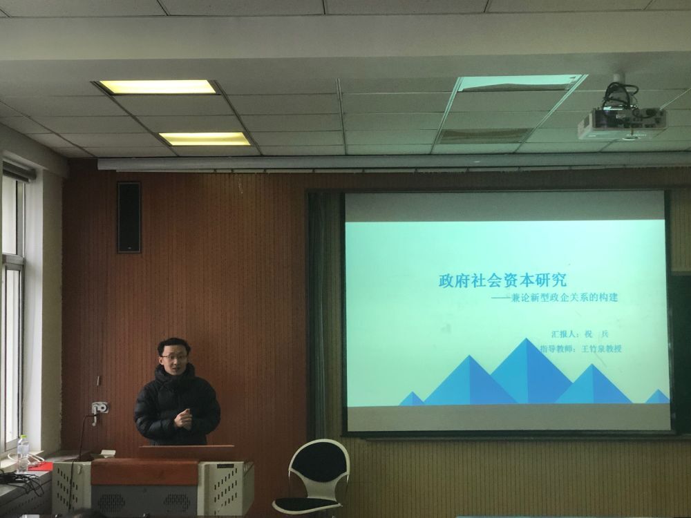 随后,教师代表祝兵博士与大家分享了题为《政府社会资本研究-兼论新型政企关系的构建》的博士论文。他详细介绍了当前我国的政企关系,提出了当前社会资源和政府资源配置方式的不足,并进行了政企契约关系的重构,最后对这个问题提出了进一步的研究展望。此篇论文分享引起了各位师生的浓厚兴趣,李长胜等教师代表提出了对论文论点的疑问并基于此与祝博士进行了深入探讨。