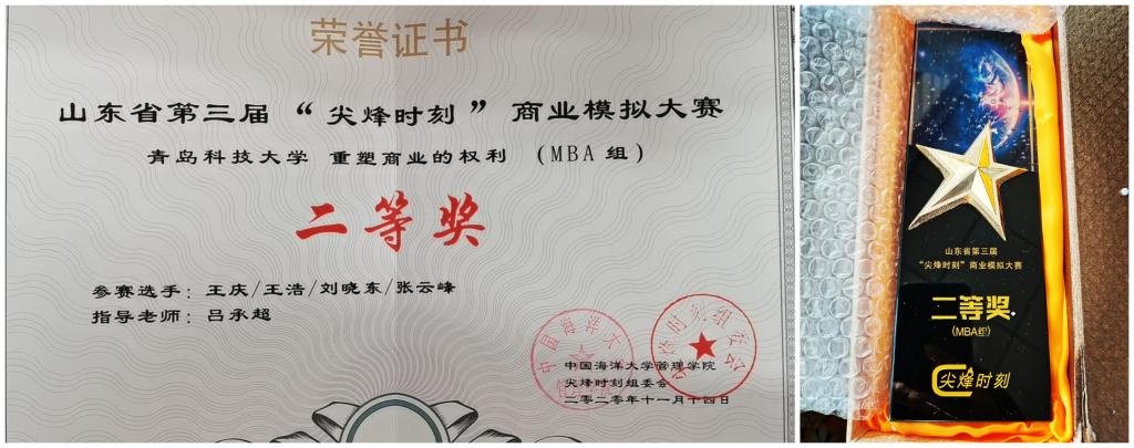 2020级MBA学员王庆、张云峰、王浩、刘晓东组成的“重塑商业的权利”队伍,在指导老师吕承超教授的指导下取得了二等奖的好成绩。