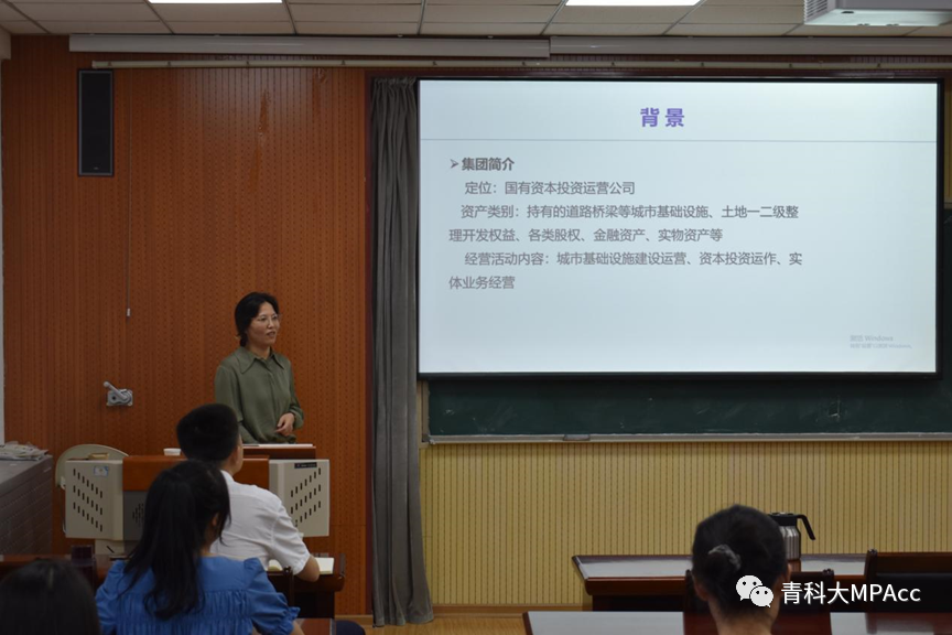 本次报告会主题是“项目全周期视角下的城投类公司的财务管理”,报告人是MPAcc校外导师、青岛城市建设投资(集团)有限公司总经理助理兼财务资金部总经理李庆香女士。