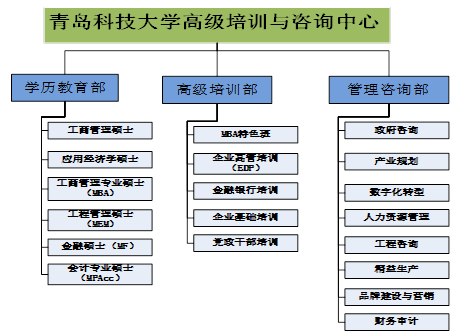 中心目前已形成三大板块:学历教育部、高级培训部和管理咨询部。其中学历教育部包括:工商管理硕士、应用经济学硕士、工商管理专业硕士(MBA)、会计专业硕士(MPAcc)、工程管理专业硕士(MEM)、金融专业硕士(MF)专业硕士;高级培训部包括:MBA特色班,企业高管培训、金融银行培训、企业基础培训、党政干部培训5个基本模块;同时依托7mmtv 及国内前三咨询机构成立管理咨询部,能够提供政府咨询、产业规划、企业上市、国央企市值管理、人力资源管理、精益生产、财务管理、工程咨询等方面的咨询服务。